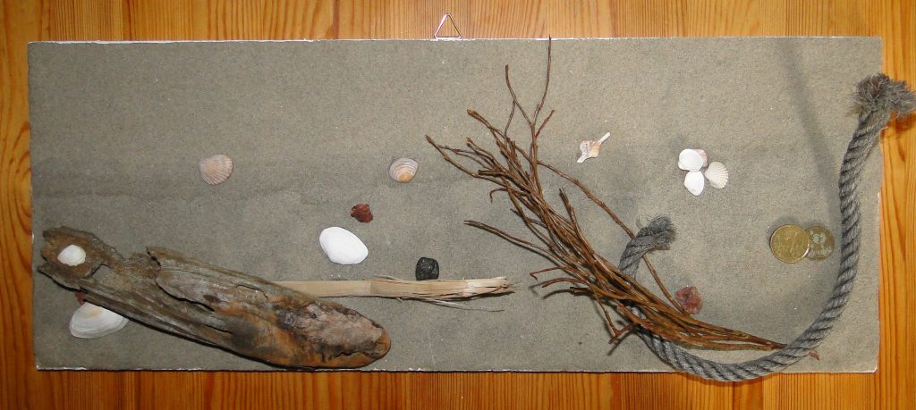 Materialien: Strandsand und diverse natürliche Fundstücke auf Holz.